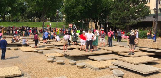 Masked and socially distanced, a handful of individuals participated in protests at McDougall Centre in Calgary and the Alberta legislature in Edmonton on Friday and Saturday.